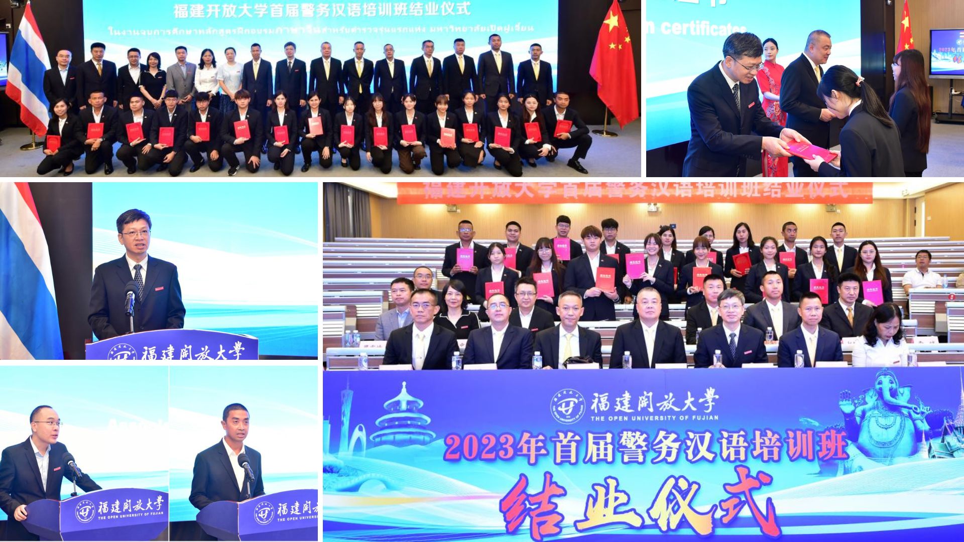 2023年9月15日,学校在桂山校区举行了“首届警务汉语培训班”结业仪式。泰国东部地区警察总署伊蒂波尔·伊蒂萨恩纳柴司令和福建开放大学党委副书记马成斌出席了仪式。马成斌代表学校对顺利结业的学员们表示热烈祝贺,并对支持和协助本次培训班开展的泰国东部地区警察总署表示衷心感谢。他指出,“首届警务汉语培训班”以语言为媒、以文化架桥,开启了学校中泰教育交流合作的新篇章。伊蒂波尔·伊蒂萨恩纳柴也发表了致辞,感谢学校举办警务汉语培训,并强调提高汉语交流能力将为东部地区的经济社会稳定提供更好的保障。公共管理学院韩瑞峰副教授作为教师代表发言,勉励学员们通过学习汉语拓宽视野,加深理解,加强友谊。泰方学员柏东代表67名学员发表感言,感谢福建开放大学提供的卓越教育资源和关怀。马成斌与伊蒂波尔·伊蒂萨恩纳柴为16名结业学员代表颁发了结业证书,学员们领取证书时喜悦之情溢于言表,结业仪式圆满落下帷幕。